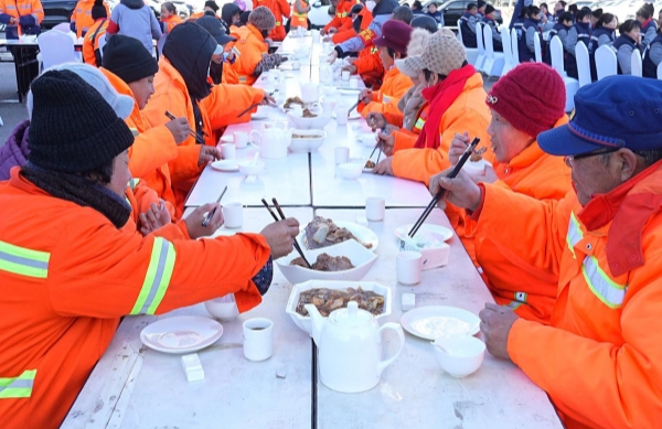 上午11时10分,家宴正式开始。热气腾腾的铁锅炖肉、寓意吉祥的年年有鱼、圆润饱满的四喜丸子等一道道美味佳肴被志愿者与到场领导亲手端上餐桌。“我干环卫工作六年了,几乎年年都来参加这个活动。”“活动不仅有好吃的,还给我们准备了实用的新年礼包。”“现在城市越来越美了,大家也越来越尊重环卫工人,这让我们很开心。”环卫工代表们一边品着佳肴,一边开心地分享到。